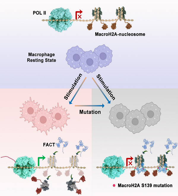 2024年8月7日,中国科学院生物物理研究所李伟研究员和首都医科大学基础医学院陈萍教授带领团队在《Molecular Cell》期刊上发表题为"FACT Mediates the Depletion of macroH2A1.2 to Expedite Gene Transcription"的研究论文。该研究首次揭示了组蛋白变体macroH2A通过S139关键位点调控分子伴侣FACT核小体维持功能的分子机制,并确定这一机制在基因转录激活及巨噬细胞功能活化过程中发挥关键作用。