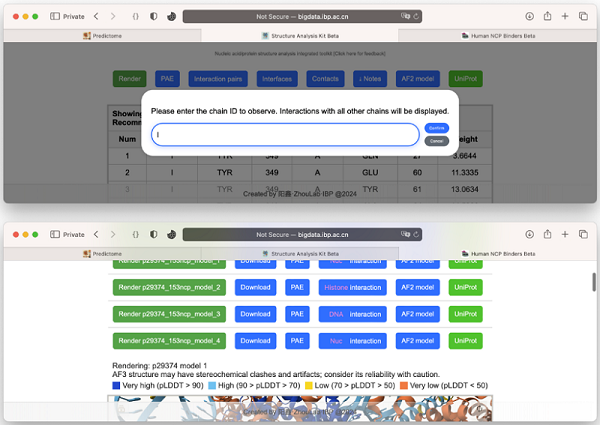 2025年8月6日,中国科学院生物物理研究所周政研究员与北京生命科学研究所徐纯福研究员在《Nucleic Acids Research》杂志合作发表了题为"AlphaFold-guided structural analyses of nucleosome binding proteins"的研究论文。该研究利用最新的AlphaFold3人工智能模型,对7600多个人类核蛋白进行了系统性筛选,生成了38,390个结构模型,首次建立了一个全面的核小体结合蛋白在线数据库和分析平台(http://bigdata.ibp.ac.cn/ncpbindersdatabase-app、http://bigdata.ibp.ac.cn/analysis-app)。研究团队开发了独创的SF评分系统,用于定量评估蛋白质与核小体的相互作用强度,就像给每个蛋白质与核小体的"握手强度"打分。评分系统整合两个关键参数:一是空间距离约束,用于判断蛋白质与核小体的物理接触;二是置信度参数(PAE和pLDDT),用于评估预测结构的可靠性。确保研究人员能够从海量的预测结构中准确识别哪些蛋白质是核小体的"真朋友"。此外,在线分析平台可接受多种文件格式(PDB、CIF或JSON),为研究者提供了强大的结构分析工具(图1)。