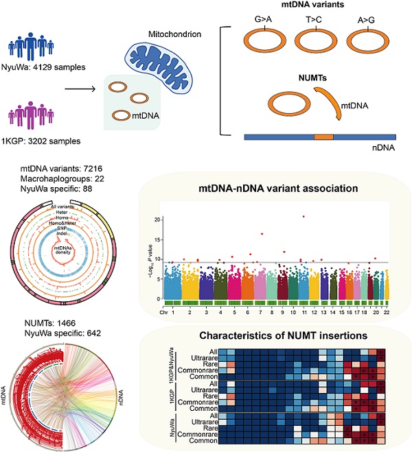 该研究鉴定了7216个不同的高质量mtDNA变异,并将其分为22个宏单倍群,同时检测到1466个NUMTs。其中,88个mtDNA变异和642个NUMT是NyuWa所特有的。全基因组关联分析显示,12个mtDNA变异与199个核DNA(nDNA)变异之间存在显著相关性。NyuWa队列和1KGP队列中的所有个体均携带常见的NUMTs,五分之一的个体携带极罕见的NUMTs,这些NUMTs倾向于插入核基因区域。与1KGP队列相比,NyuWa队列中的罕见NUMTs在长散在核元件(LINEs)中表现出显著的核断点富集。