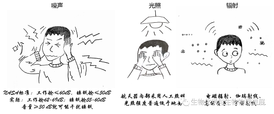 太空中影响睡眠的主要环境因素有:微重力、昼夜节律、光照、噪声、辐射、空气质量等。