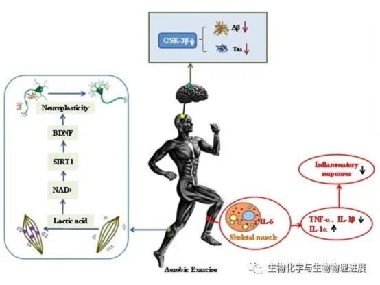 目前药物治疗AD主要通过精神病理药物以控制焦虑、抑郁,并结合调节中枢胆碱能活动、改善记忆力等药物以促进智力水平恢复,进行对症支持治疗,尽管药物可在一定程度上减轻病理症状,但停药后极易复发,且费用较为高昂,严重影响治疗依从性。通过非药物干预的运动疗法逐渐被大众所关注。越来越多的研究表明,长期保持规律性有氧运动可以有效预防和改善AD病理。有氧运动也称"有氧代谢运动",是指机体维持长时间中、低运动负荷强度,且机体氧气得到充足供应并满足运动所需摄氧量的一种运动方式,常见有氧运动种类包括:慢走、慢跑、游泳、健身操等【5】。有氧运动在减少Aβ沉积和Tau磷酸化、改善血管微循环、增强自身免疫功能、促进能量新陈代谢等方面发挥作用,因而被认定是有效预防、延缓和治疗早期AD病理的有效干预手段。那么,有氧运动具体的作用机制是什么呢?