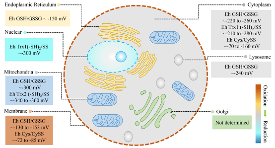 首先,细胞和机体本身的氧化还原状态是不同的。不同的氧化还原指标(species)反映的氧化还原状态不同,例如在胃癌中,癌旁组织中谷胱甘肽(GSH)水平显著高于癌症组织,而抗氧化酶水平却没有显著差异。同时,氧化还原状态具有时空依赖的精准调控。细胞中不同的位置(place)氧化还原状态不同,例如不同细胞器中的氧化还原状态不同(如下图)。机体在不同的时期(time)的氧化还原状态也不同,细胞周期的不同阶段、昼夜节律、季节、生命的不同阶段、外部环境和病理条件等均造成氧化还原状态不同,例如有研究发现氧化还原对NADPH/NADP+的比例在细胞分裂时显着增加,并在分裂后恢复到原始水平;再比如内源性H2O2水平在细胞和小鼠肝脏中表现出节律性地振荡,贯穿整个生理周期;在线虫衰老过程中,细胞质和线粒体的氧化还原状态随着年龄的增长更氧化,而内质网中的氧化还原状态则随着年龄的增长而更还原。另外,在整体水平上,不同个体之间的氧化还原状态也存在差异。不同氧化还原状态与其功能调控密切相关,例如内质网的偏氧化特性与蛋白质氧化折叠功能密切相关。不同水平(level)的ROS/RNS针对不同修饰底物(target)可能发挥不同的调控功能,例如低水平的氧化剂处理会延长线虫的寿命,而高水平的氧化剂则会导致线虫寿命的缩短。