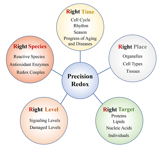 (Right species 是指在研究或应用氧化还原时需要关注特定的氧化还原指标,包括活性小分子(ROS/ RNS /RClS/ RBrS/ RSS/ RCS/ RSeS)、抗氧化酶和不同的氧化还原对。Right place意味着不同的细胞器,不同的细胞类型或不同的组织都应该被考虑。Right time强调需要考虑不同时期氧化还原状态的动态变化,如细胞周期的不同阶段、昼夜节律、季节、衰老或疾病过程。Right level是指要注意氧化还原作用的有效范围,否则氧化水平过高将导致氧化应激损伤,或还原水平过高将导致还原应激。Right target有两种含义:一是在分子水平上调控特定底物(如蛋白质、脂质和核酸)的氧化水平,二是在宏观个体水平上为不同个体建立不同的抗氧化应用方法。)