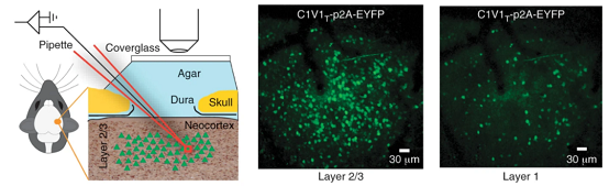 图6. 光遗传技术实验装置、实时观察大脑内神经元的示意图【10】