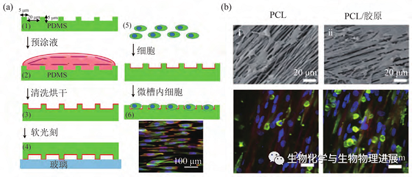细胞培养模型常常借助于小小的培养皿、培养瓶或者培养板培养,操作方便、快捷,采用此方法培养的细胞是任意伸展生长的,与天然心肌特定取向性的生理特征不一致。因此,研究者开始尝试利用微纳加工、静电纺丝等各种工程技术实现具有特定取向排列的体外心肌模型构建。微图案加工技术(图a)是通过对材料基底表面形貌的精确控制,从而引导细胞沿表面形貌生长,以此实现对细胞排列方式和形态的调控【5】。静电纺丝技术(图b)是通过模仿天然细胞外基质(extracellular matrix,ECM)结构特征,结合纤维疏松多孔的结构实现心肌组织的取向排列【6】。
