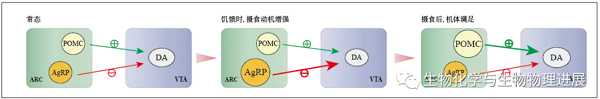 动机行为的产生受到内在需求(饥饿、睡眠、口渴等)和外在诱发刺激(美食、成瘾物质等)的影响【2】,是为了满足自身需求。由DA介导的奖赏相关行为,包括食物摄取和药物滥用【3】。虽然关于摄食行为研究的发现主要集中于体重管理、能量消耗和食物摄取量等方面,关注脑区主要是下丘脑【4】;但因为摄食和奖赏间的紧密关联【5】,对于摄食神经机制的研究也从奖赏相关行为切入,围绕中脑腹侧背盖区(ventral tegmental area, VTA)至伏隔核(NAc)这样的神经环路或者DA神经元展开【6】。因此,可以认为摄食行为的调控依赖于内稳态相关的下丘脑黑皮质素(melanocortin, MC)系统和奖赏相关的DA系统的相互作用【7】。MC系统中包含两类在摄食调控中功能相对的神经元,即抑制进食的前阿黑皮素原(proopiomelanocortin, POMC)神经元和促进进食的刺豚鼠相关蛋白(agouti-related protein, AgRP)神经元【8】。在摄食过程中,POMC神经元和AgRP神经元释放的神经递质和神经肽作用于VTA神经元上的相应受体, 动态调节DA神经元的活性,掌管摄食行为的完成【9】。