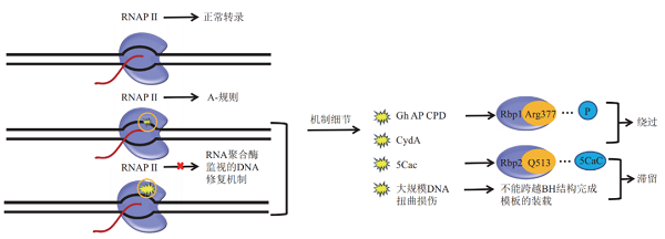 转录过程中,RNAP沿模板链的行进路途并非一帆风顺,基因组DNA总是不可避免的遭受内外环境带来的损伤。转录模板链上的DNA损伤,如单链断裂、双链断裂等会阻碍RNAP在模板链上的正常前行【1】。