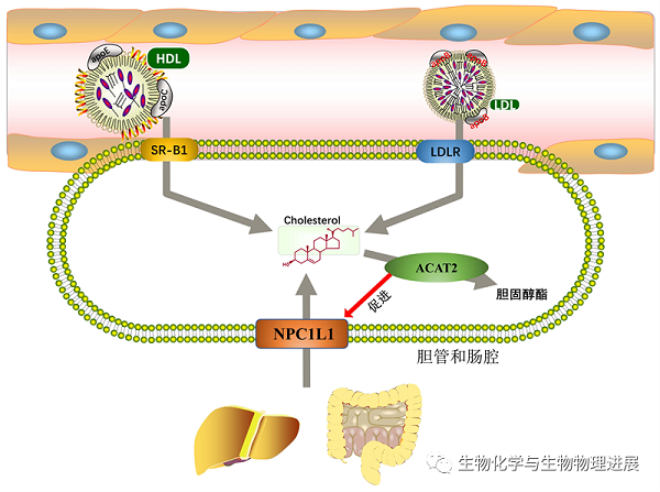 机体吸收及转运胆固醇的方式,分为食物中胆固醇摄取、低密度脂蛋白(LDL)胆固醇摄取和高密度脂蛋白(HDL)胆固醇摄取。这三个过程分别需要尼曼-匹克C1型类似蛋白1(Niemann-Pick type C1-like 1,NPC1L1)、低密度脂蛋白受体(low-density lipoprotein receptor,LDLR)、B族清道夫受体1 (scavenger receptor class B1,SR-B1)摄取胆固醇。