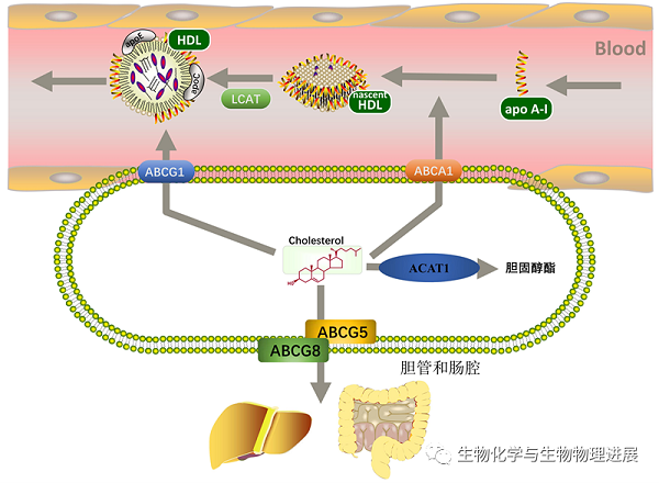 尽管体内所有细胞均能合成胆固醇,但大多数细胞无法分解胆固醇,需要将多余游离胆固醇排出细胞,或将其转化为胆固醇酯储存在细胞脂滴中。细胞膜上载脂蛋白A-I结合蛋白(apolipoprotein A-I binding protein,AIBP)及4种ATP结合盒式蛋白(ATP-binding cassette transporter,ABC)A1、G1、G5、G8能特异性介导细胞内胆固醇流出。