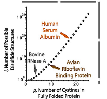 随着二硫键数目p的增加,蛋白质分子可能形成的二硫键异构体数目i呈指数级增长。