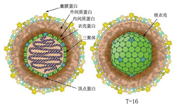 疱疹病毒是一类具有囊膜的双链DNA病毒,能够感染包括人类在内的几乎所有脊椎动物及部分无脊椎动物。疱疹病毒主要感染皮肤、黏膜和神经等组织,引发感染部位产生多种疾病,严重威胁人类和其他动物的健康。目前已经发现9种能够感染人类的疱疹病毒,造成单纯疱疹与生殖器疱疹(HSV-1与HSV-2感染)、水痘与带状疱疹(VZV感染)、传染性单核白血球增多症与鼻咽癌(EBV感染)、卡波西氏肉瘤(KSHV感染)等疾病。疱疹病毒的结构由内而外依次是基因组DNA、衣壳、间质蛋白层和囊膜(图1)。