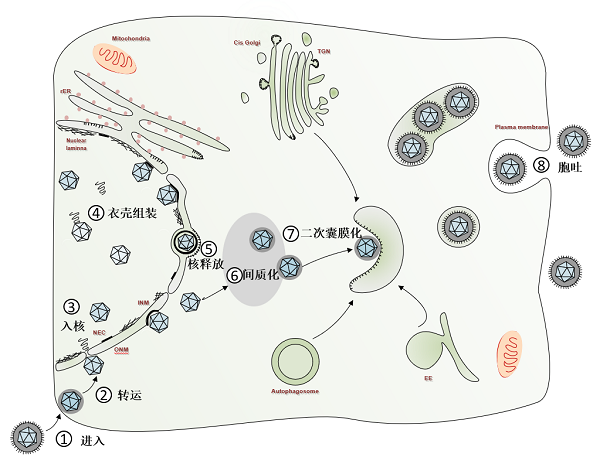 根据特征性基因表达情况的不同,疱疹病毒感染宿主呈现两种感染历程,分别是潜伏期(latency)和裂解期(lytic reactivation)[1]。在潜伏期,病毒基因组在细胞内环化,并以附加体(episome)的形式结合在染色体上。这个时期不会产生病毒颗粒,仅仅表达一小部分基因。在外界刺激下,疱疹病毒可由潜伏期进入裂解期[2]。如图2所示,在裂解期,从头感染的病毒首先通过囊膜上的糖蛋白与宿主细胞膜表面上的受体结合,随后通过病毒囊膜与细胞膜的融合进入细胞。病毒颗粒进入细胞后,部分间质蛋白从核衣壳上解离下来,核衣壳通过微管运输到细胞核附近,通过核孔将病毒基因组DNA释放到细胞核中。在细胞核中进行基因组DNA复制及病毒蛋白的表达,并完成病毒基因组的包装,组装成新的核衣壳。组装完成的核衣壳需要在核释放复合体(NEC)的辅助下跨越两层细胞核膜,从而进入到细胞质中。接着病毒颗粒在细胞质中获得间质蛋白和囊膜进一步成熟。最后,成熟的病毒颗粒经由胞吐作用释放到细胞外,进而感染其他的细胞[3]。