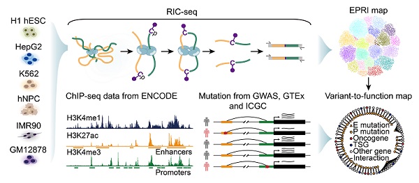 研究人员将非编码区突变映射到增强子-启动子RNA互作(EPRI)图谱,发现有超过53万个突变落在启动子和增强子RNA相互作用位点,提示这些突变可能破坏EPRI导致基因转录异常,从而引发疾病。因此,该研究团队在EPRI图谱的基础上构建了"突变-功能"图谱,系统地注释了非编码突变可能影响的靶标基因,为理解疾病发生的潜在机制提供了宝贵的资源。