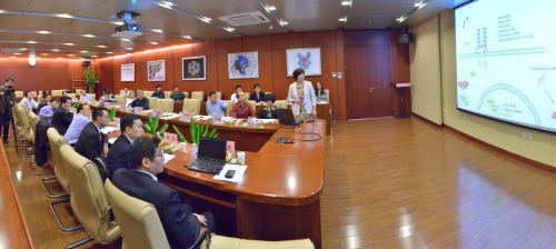 蛋白质多肽药物实验室的与会专家分别介绍了自己科研成果:梁伟研究员报告了“靶向给药系统-纳米胶束”;秦志海研究组陶宁博士介绍了“以髓样抑制性细胞为靶点的新型香菇多糖分子抗肿瘤研究”;杭海英研究员报告了“抗体高速人工进化”;杨福全研究员报告了“蛋白质组学技术及其应用—从生命科学基础研究到生物医药研发”;蒋太交研究员报告了“生物信息学与计算生物学”;阎锡蕴研究员汇报了“新型肿瘤治疗及诊断抗体药物”项目。