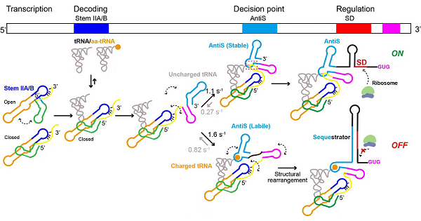 基于上述系列发现,研究团队提出T-box核糖开关的共转录调控模型(图1),首次系统阐明了其在转录过程中分步识别tRNA、鉴别氨酰化状态、动态切换构象并最终调控基因表达的完整动态过程。
