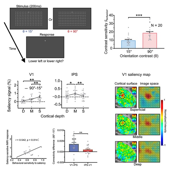 视觉刺激由朝向相同的背景线条和一小块朝向不同的前景线条组成,前景刺激的视觉显著性通过前景和背景的朝向差异实现精确调节。行为学实验发现,被试对显著性更强的前景刺激有更好的检测能力。7T 亚毫米VASO fMRI结果发现,V1表层的信号表征了视觉显著性地图,符合侧向连接的分层模式,并通过前馈通路传递至IPS中间层。并且,V1表层的显著性信号强度能够预测被试对前景刺激的检测能力。这些结果支持视觉显著图在V1表层通过侧向连接计算产生,并传送到顶叶等高级脑区实现自下而上的注意选择。该研究为"V1显著性假说"的视觉注意计算理论提供了重要的人脑介观尺度功能证据,有可能帮助类脑视觉模型的发展。