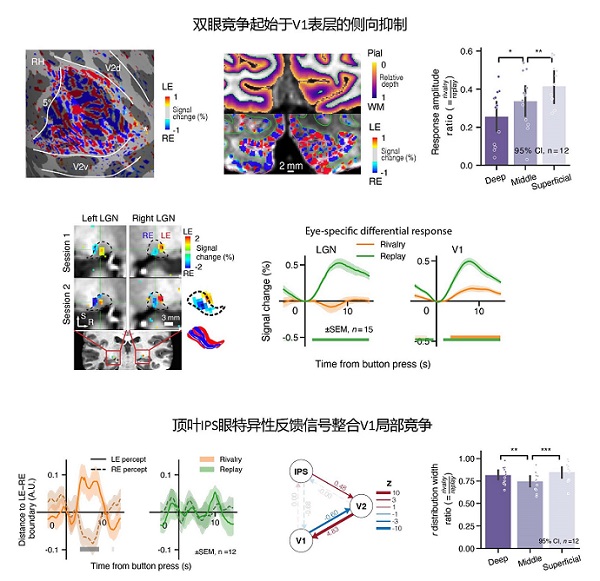 研究发现,双眼竞争起始于初级视觉皮层(V1)眼优势功能柱(ocular dominance columns)表层的侧向抑制,而非丘脑外膝体(LGN)。这一7T fMRI证据解决了清醒猴电生理和传统3T fMRI研究的长期分歧,说明视觉冲突的解决源于早期感觉皮层而非丘脑的抑制性神经环路。研究进一步揭示,虽然受试者无法意识到视觉刺激来自哪只眼睛,来自顶叶注意网络(intraparietal sulcus, IPS)的眼睛特异性的反馈信号能够调节和同步V1功能柱表层和深层的局部竞争,整合形成知觉意识。