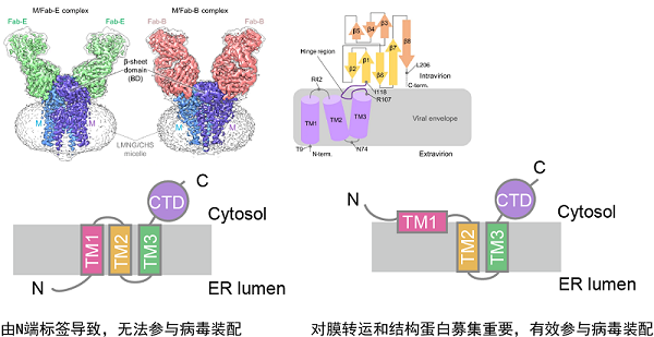 令人不解的是近期解析的多个M蛋白结构均呈现三次跨膜的拓扑构象。研究表明,M蛋白的正确朝向对N端的氨基酸组成极为敏感,而为纯化蛋白所添加的N端标签会显著增加错误朝向发生的概率。此外,在大量表达时,三次跨膜的构象稳定性会优于两次跨膜,这也使得纯化过程无形中富集了错误构象的蛋白。这一意外结果也提示,在基于纯化蛋白的膜蛋白结构解析中,应慎重判断其内源情况下的膜朝向。