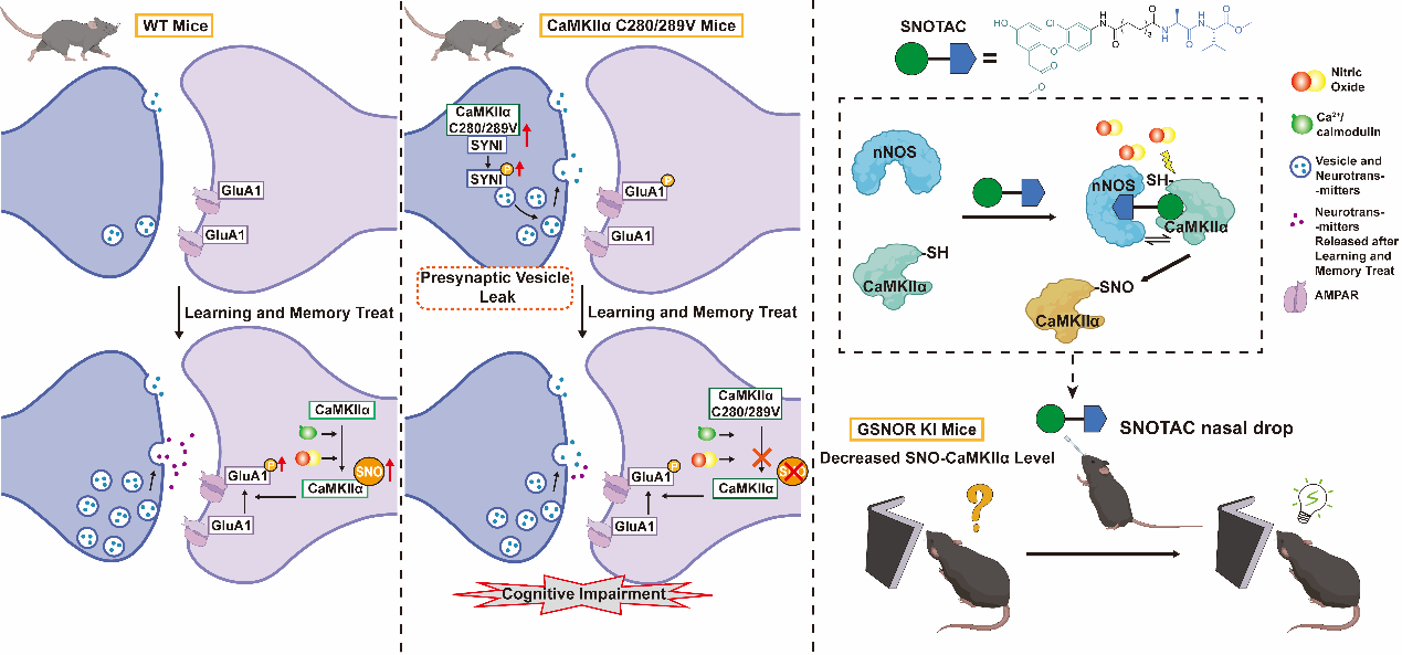 为了解答上述问题,陈畅研究组首先探究了CaMKIIα亚硝基化水平在生理性学习记忆过程中是否变化。当野生型小鼠接受学习记忆任务后,其海马组织中CaMKIIα的亚硝基化水平会显著升高。研究人员构建了无法进行这种修饰的突变小鼠模型。多种学习记忆相关行为学检测结果表明, 这些突变小鼠均表现出明显的记忆能力损伤。这些结果综合确证了CaMKIIα亚硝基化修饰是调控生理性学习记忆过程的一种全新机制。深入研究发现,CaMKIIα一旦失去亚硝基化修饰,会导致在神经静息状态下,突触前神经囊泡的释放水平会异常升高。这种持续的、浪费性的“放电”耗竭了突触囊泡资源。其严重后果是,当真正需要响应学习记忆任务刺激时,突触的信号响应能力显著不足,导致学习记忆功能下降。研究人员进一步探索能否通过精准提高其修饰水平来挽回记忆损伤。基于陈畅研究员提出的“精准氧化还原”理念及抗氧化药物研发的“5R”原则,研究人员开展了精准靶向CaMKIIα的亚硝基化干预手段研究。针对CaMKIIα亚硝基化的精准调控,研究人员提出了一种普适的“胶水”策略——通过小分子将靶蛋白与一氧化氮合酶拉近,使其产生的NO选择性作用于靶蛋白进而实现精准的亚硝基化修饰,创新设计并合成了亚硝基化靶向嵌合体SNOTAC。