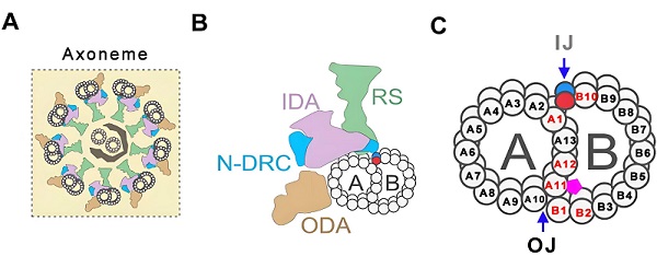 纤毛/鞭毛是广泛存在于真核生物中的特殊细胞器,其核心结构是微管及相关蛋白组装成的轴丝复合体(Axoneme)。轴丝外周由9组二联体微管(Doublet microtubules,DMTs)构成,每个DMT又由A管和B管组成。其中A管为完全微管,由13根原纤丝环绕而成;B管为不完全微管,仅含10根原纤丝。A管与B管存在两个连接位点,分别称为外侧连接点(Outer junction,OJ)和内侧连接点(Inner junction,IJ)(图1)。A管与B管的紧密连接对于维持DMTs稳定性发挥至关重要的作用,若DMT-B管发生开放,将直接影响各种轴丝附属结构的附着或功能协调。因此,明确纤毛轴丝DMTs结构中A管与B管连接的组成蛋白和调控机制,一直是纤毛研究领域的关键科学问题之一,对于理解轴丝结构、纤毛功能及其纤毛病发病机理有重要价值。