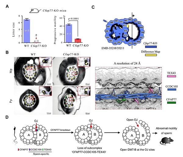 在前期研究中,孙飞课题组利用原位冷冻断层扫描技术(cryo-ET)结合人工智能(AI)解析了哺乳动物精子轴丝DMTs的高分辨率原位结构(Cell Discovery,2023)。该研究发现,CFAP77是物种间保守的OJ核心组成蛋白,能够结合A11-A12和B01-B02原纤丝;此外,CCDC105和TEX43也定位于OJ部位并结合A11-A12原纤丝,且这两种蛋白仅存在于精子鞭毛中,在其他类型纤毛中不表达。在本研究中,研究团队构建了Cfap77基因敲除小鼠模型。表型分析显示,Cfap77-KO小鼠出现雄性不育特征,其精子数量和形态基本正常,而精子运动能力存在明显缺陷(图2A)。通过透射电镜观察发现,Cfap77-KO小鼠精子轴丝中约45%的DMT-B管出现明显开放现象(图2B)。蛋白表达与功能表型的完美对应,充分证实了CFAP77蛋白在维持DMTs中A-B管OJ部位连接方面的关键生物学功能。