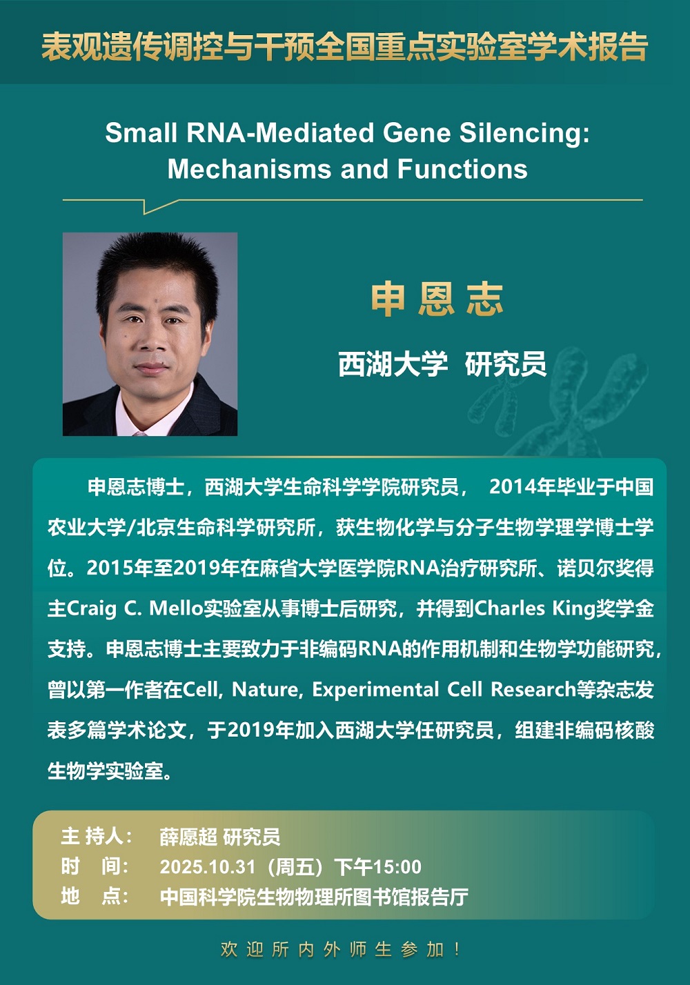 2025年10月31日下午15:00 表观遗传调控与干预重点实验室学术报告:Small RNA-Mediated Gene Silencing: Mechanisms and Functions